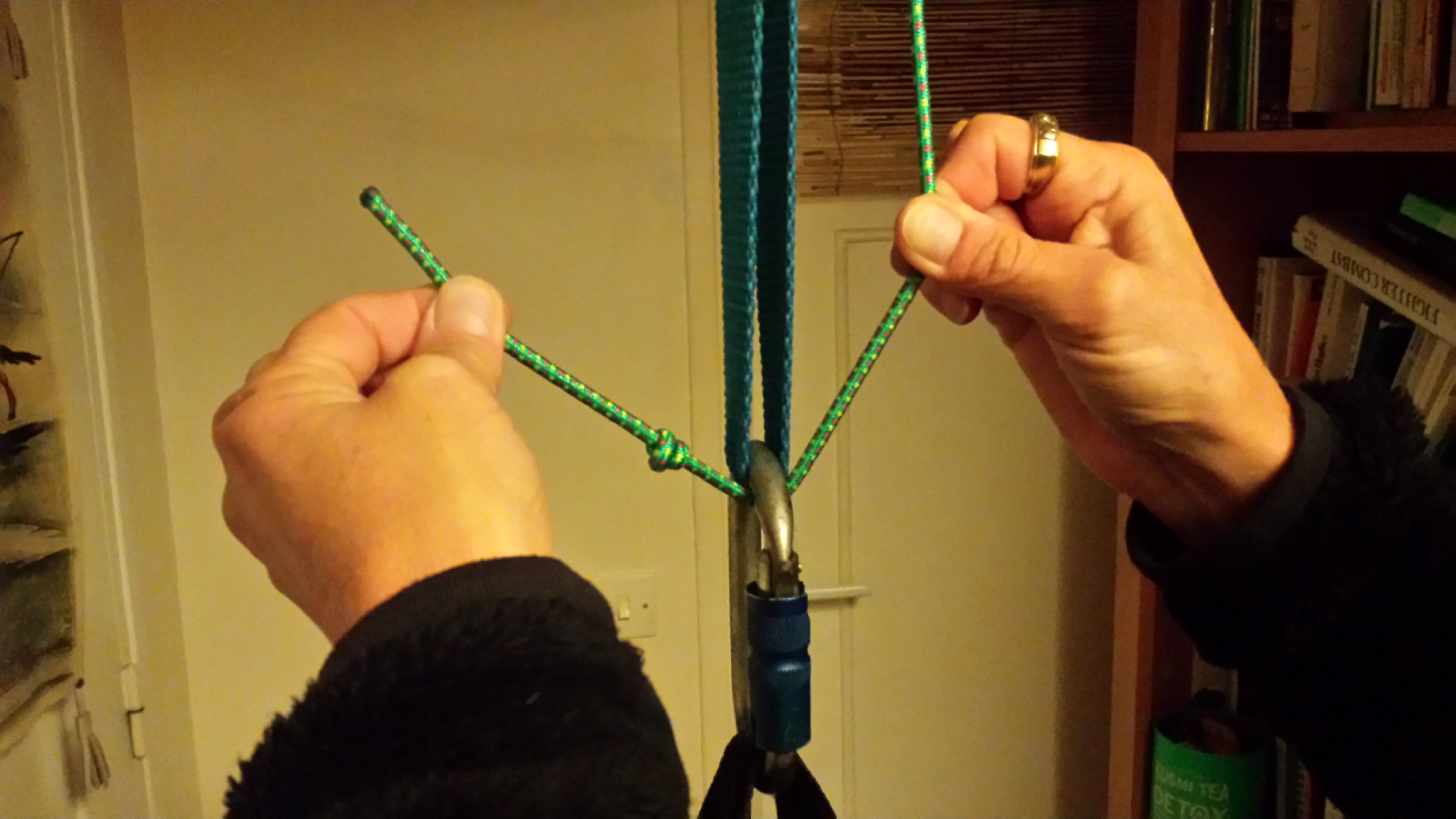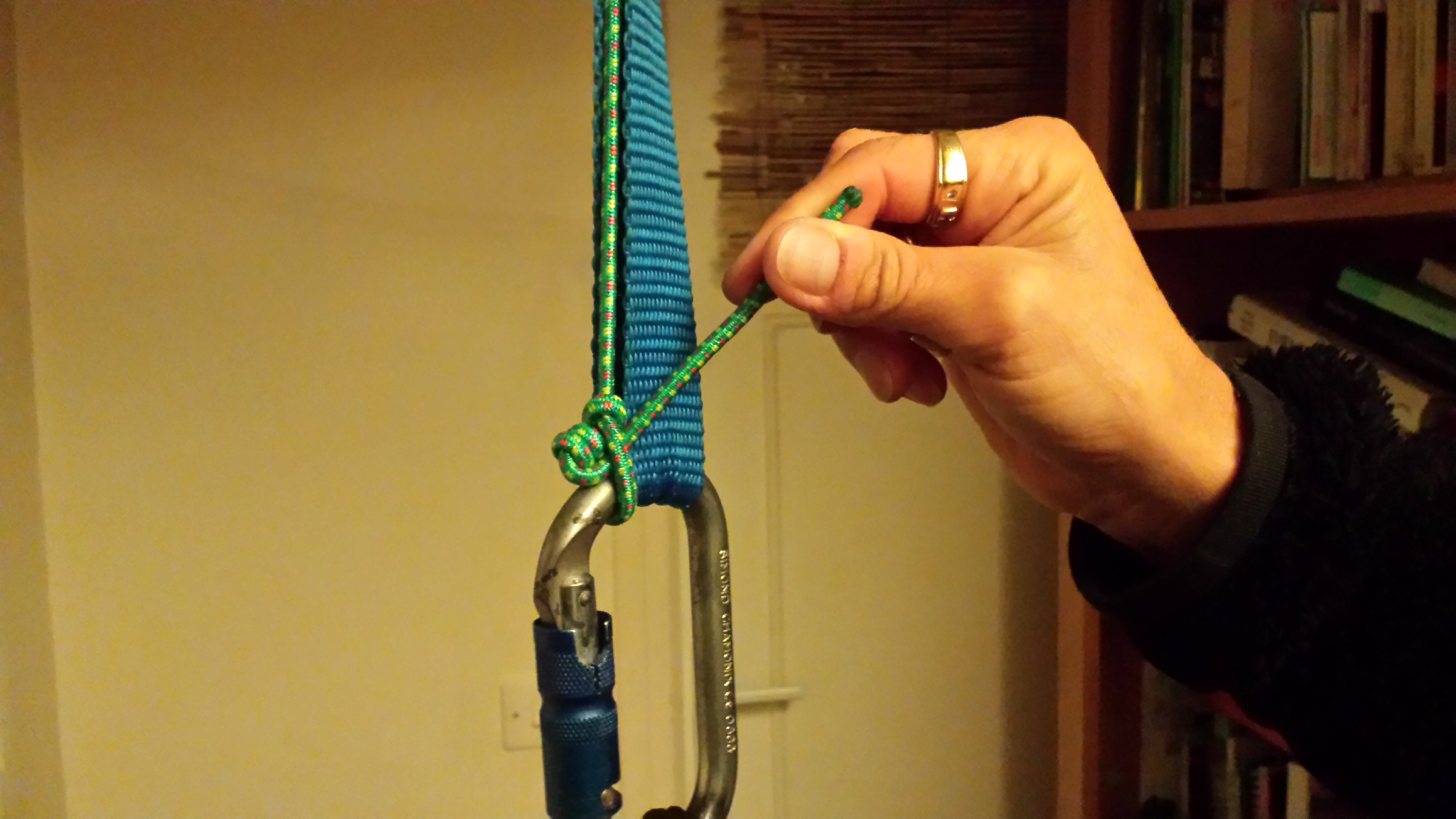 on passe l’élastique dans l’anneau de quille, puis sur l’avant du mousqueton